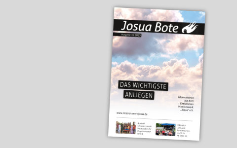 Unsere Zeitschrift „Josua Bote“ erscheint viermal jährlich und wird kostenlos versandt. Sie informiert über die Arbeit des Missionswerkes und gibt geistliche Impulse.